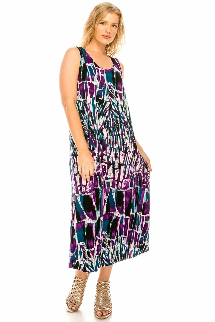 Sleeveless and soft round-neckline long dress with a variety of prints available and 51 inches in length.Hand or machine wash in cold water.Made in USA.90% Polyester, 10% Spandex.