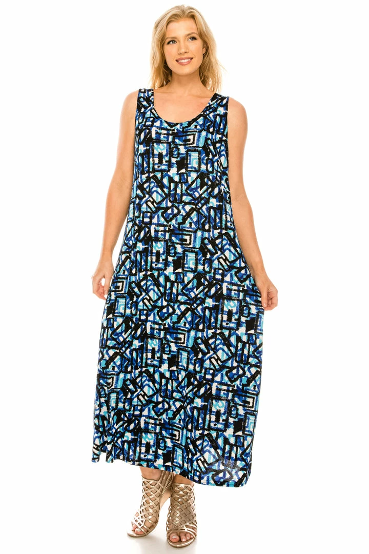 Sleeveless and soft round-neckline long dress with a variety of prints available and 51 inches in length.Hand or machine wash in cold water.Made in USA.90% Polyester, 10% Spandex.
