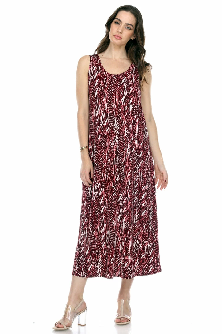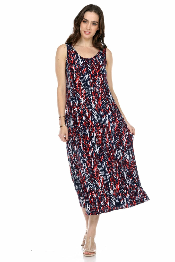 - Sleeveless and soft round-neckline long dress with a variety of prints available and 51 inches in length.