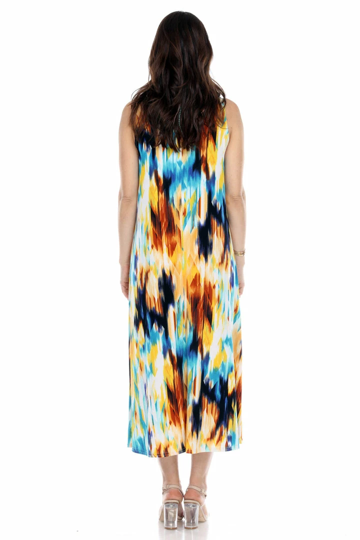 - Sleeveless and soft round-neckline long dress with a variety of prints available and 51 inches in length.