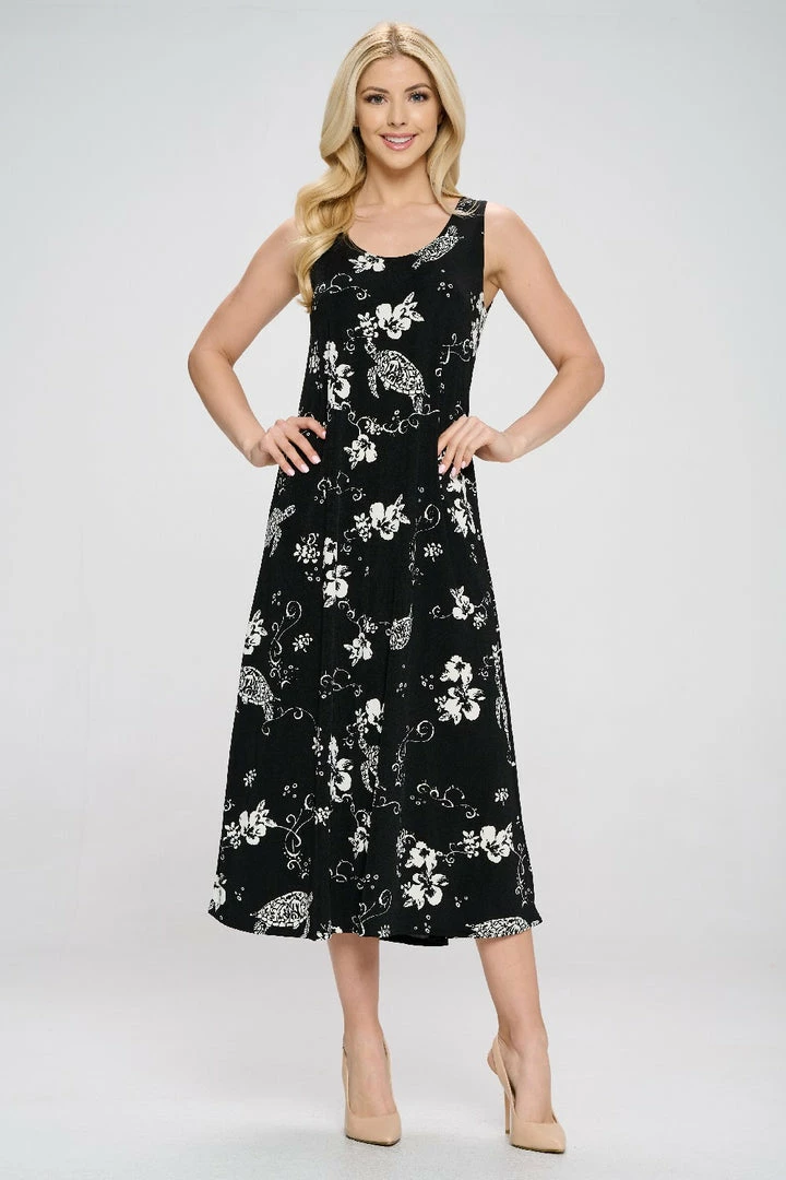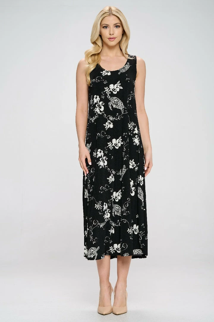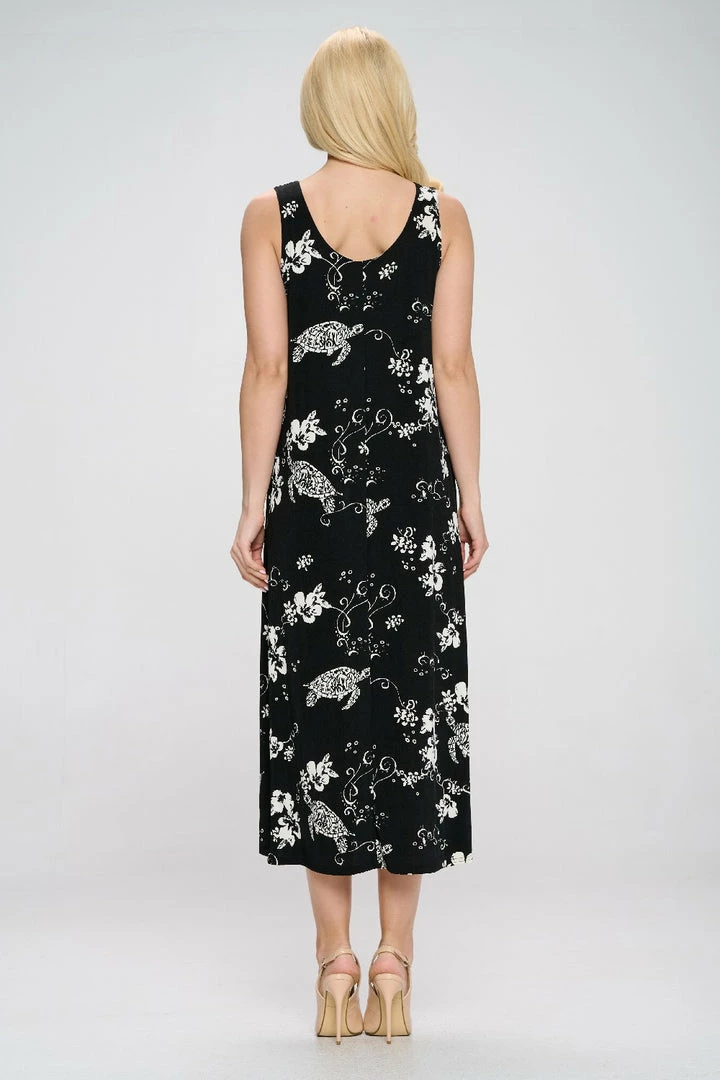 - Sleeveless and soft round-neckline long dress with a variety of prints available and 51 inches in length.