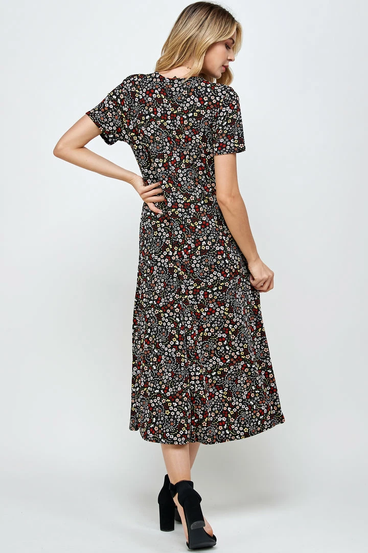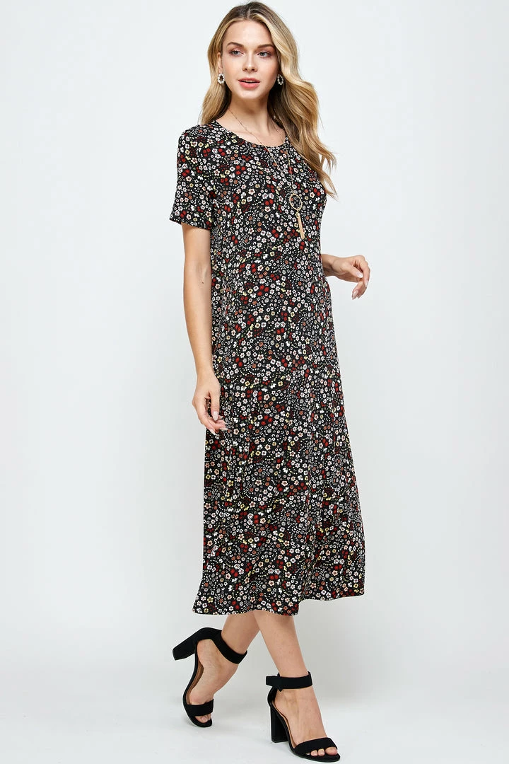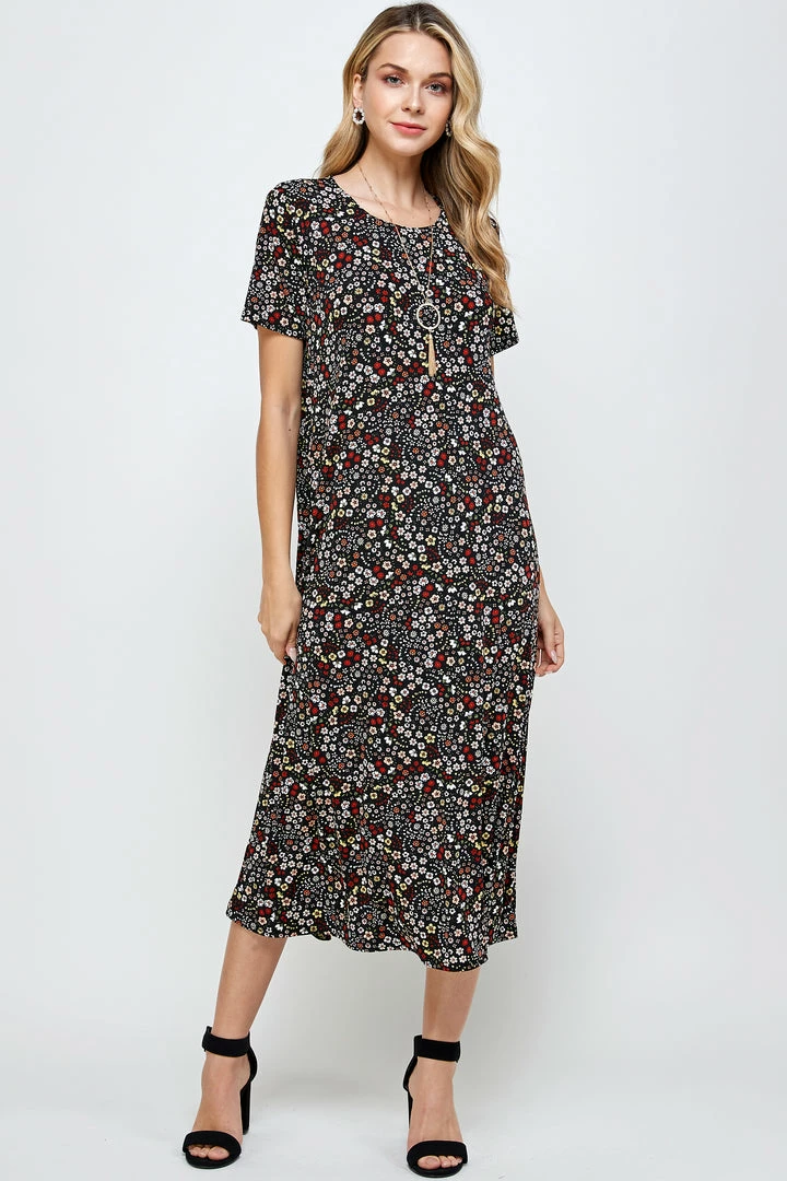 - Short sleeve and soft round-neckline long dress with a variety of prints available and 49 inches in length.