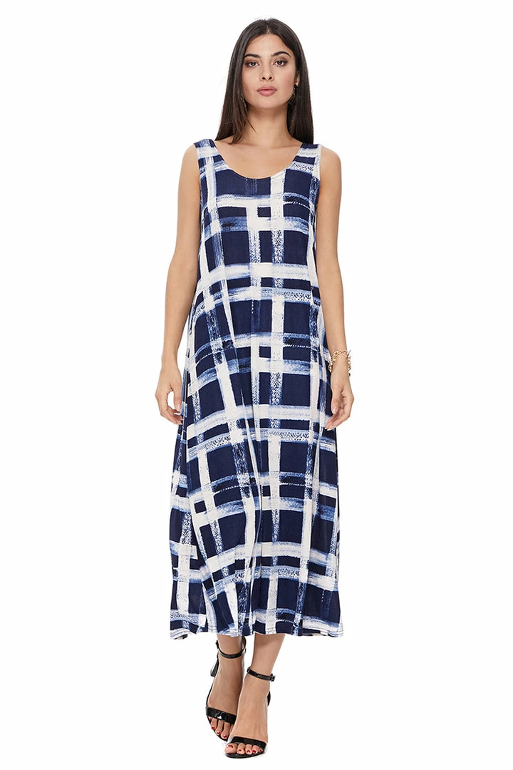 Sleeveless and soft round-neckline long dress with a variety of prints available and 51 inches in length.Hand or machine wash in cold water.Made in USA.90% Polyester, 10% Spandex.