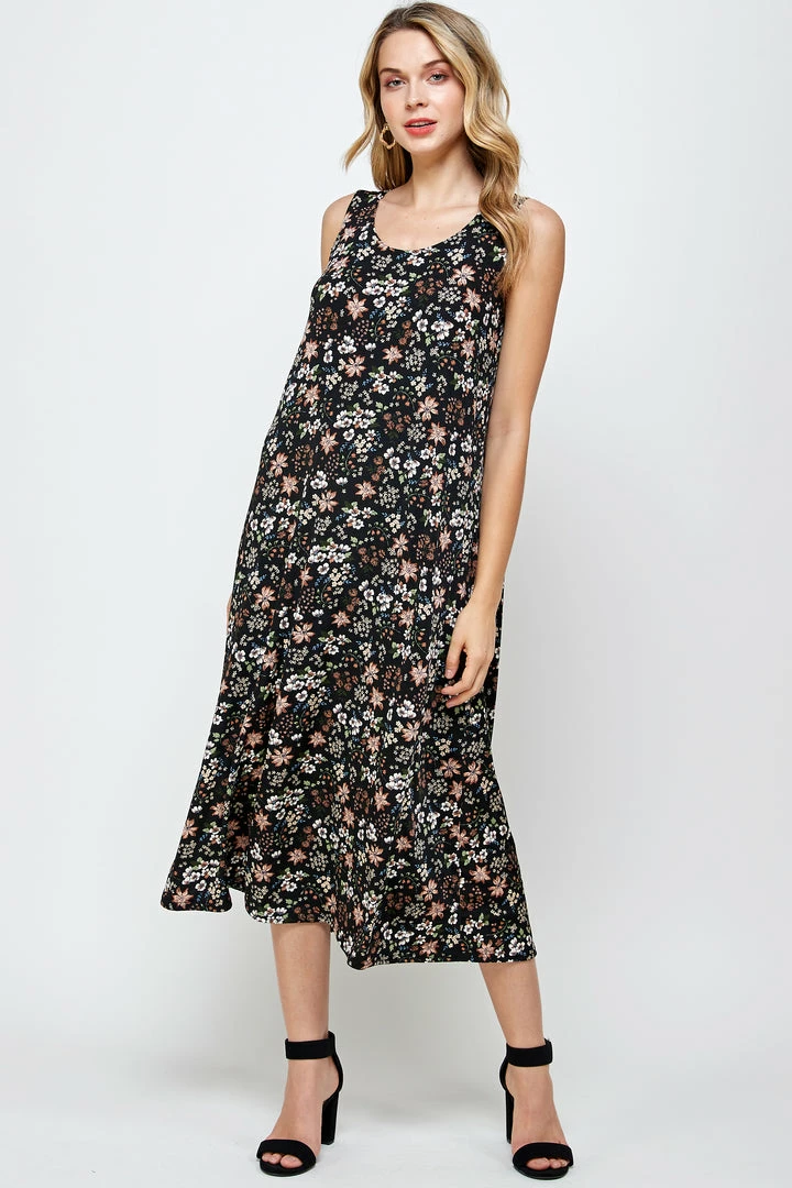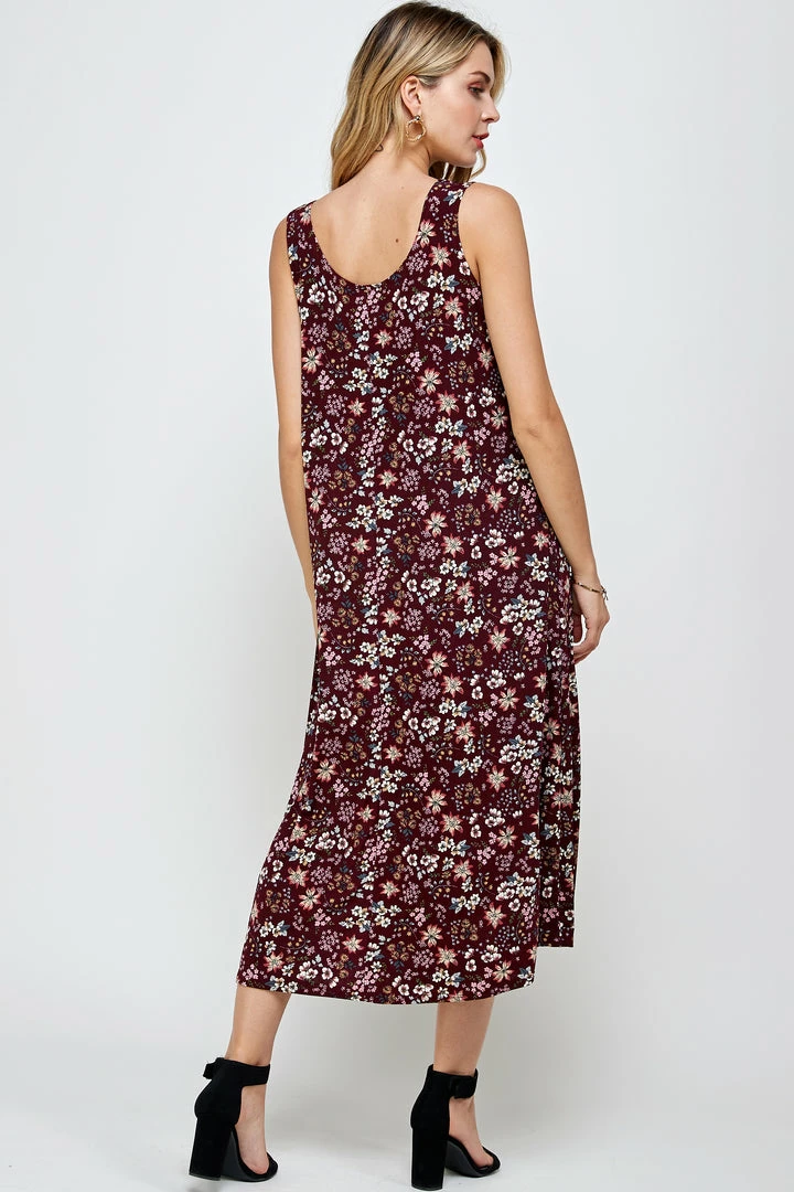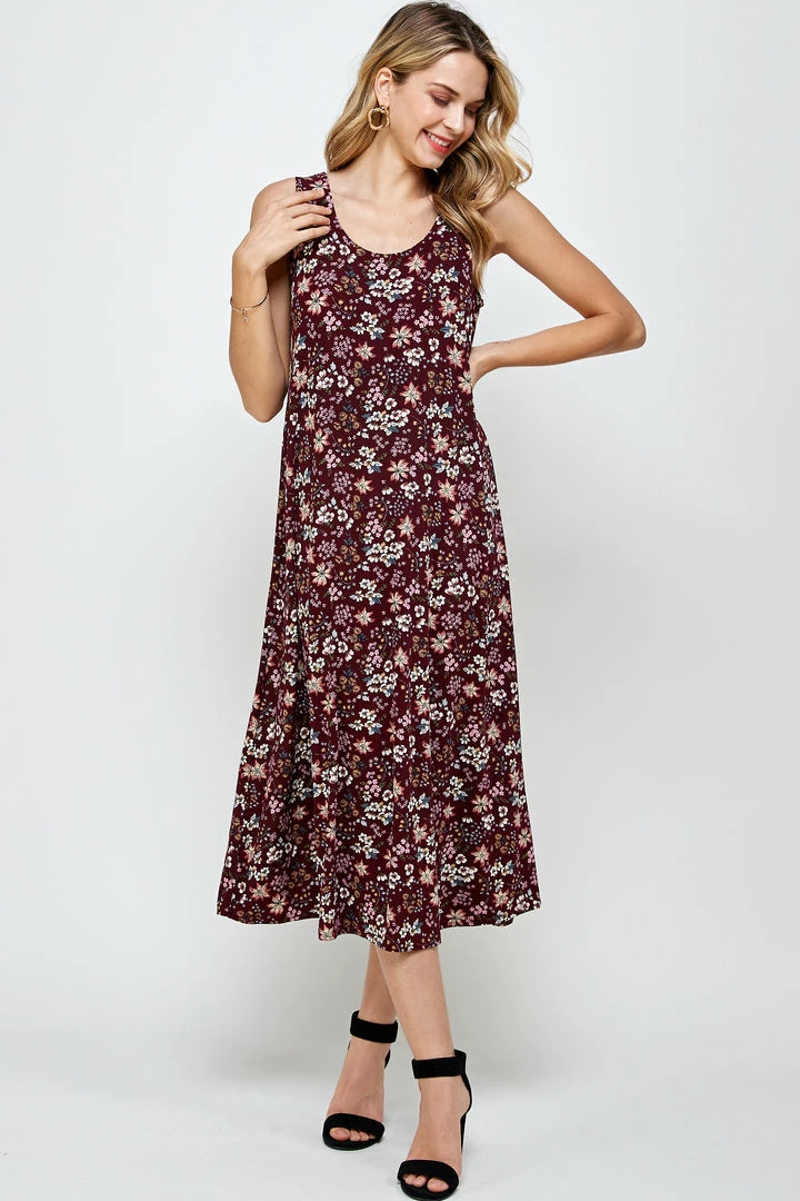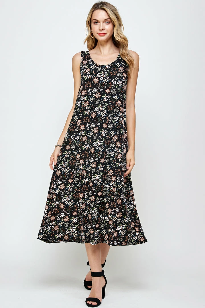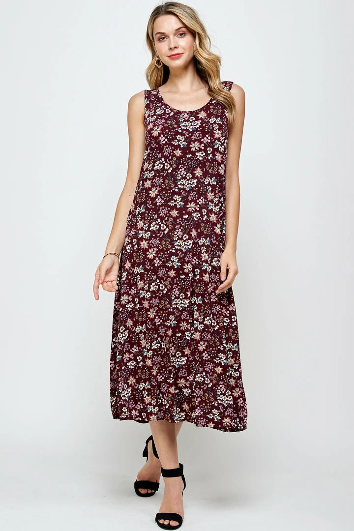 - Sleeveless and soft round-neckline long dress with a variety of prints available and 51 inches in length.
