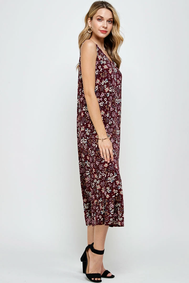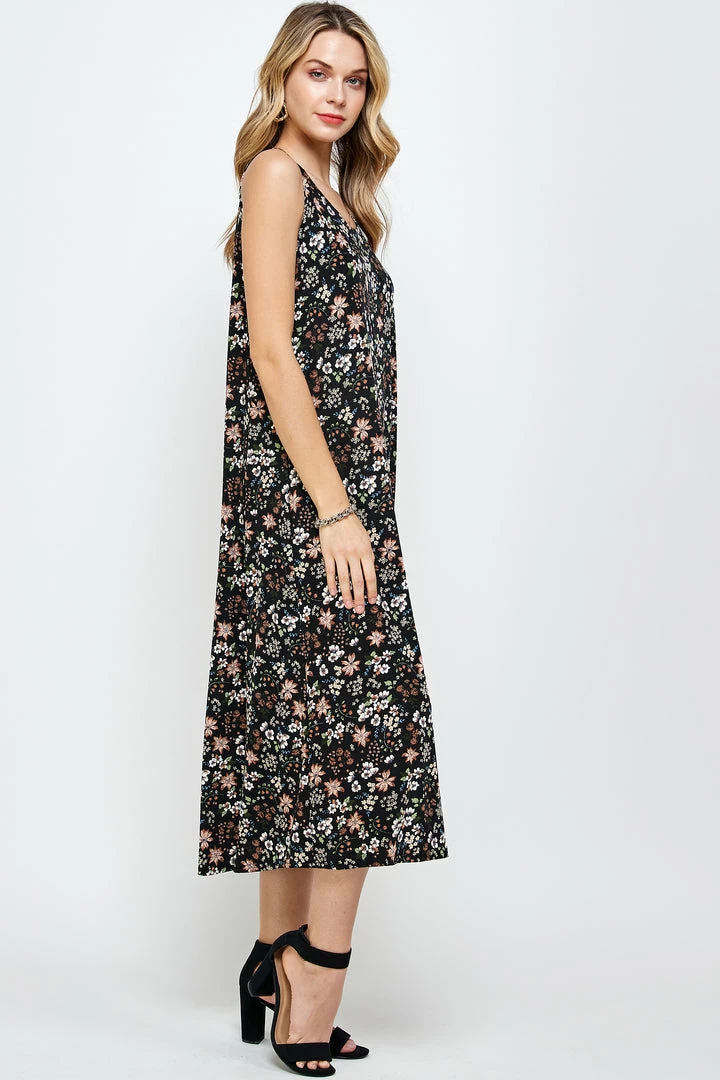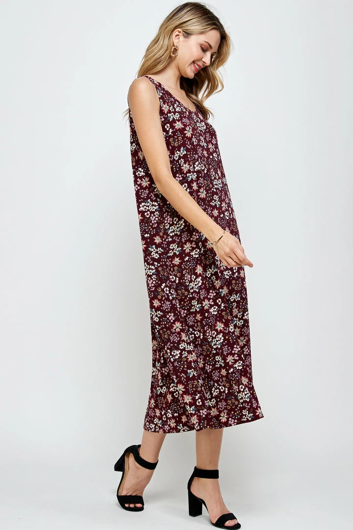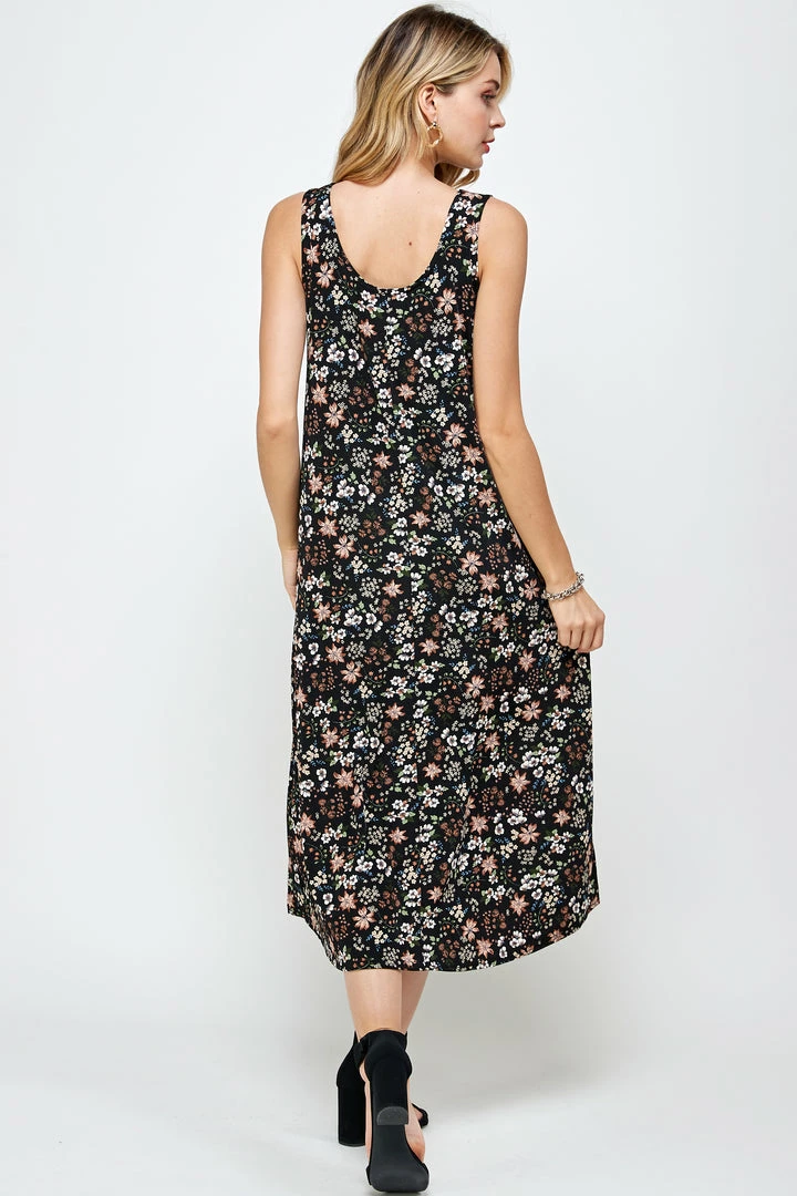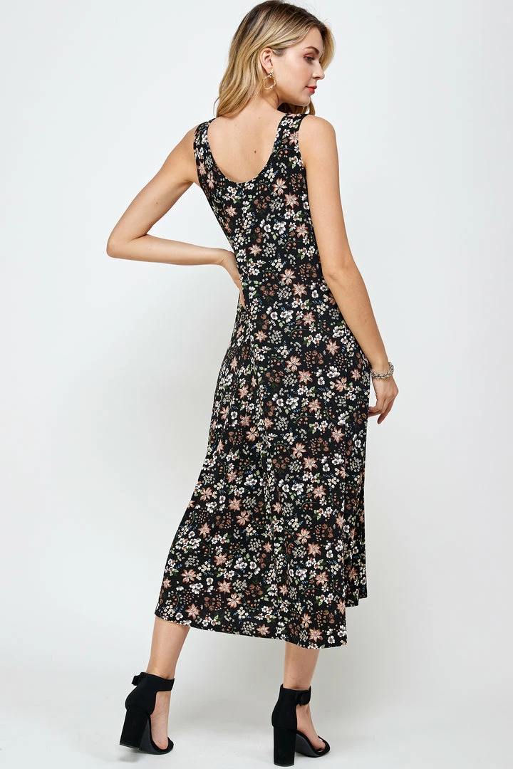 - Sleeveless and soft round-neckline long dress with a variety of prints available and 51 inches in length.