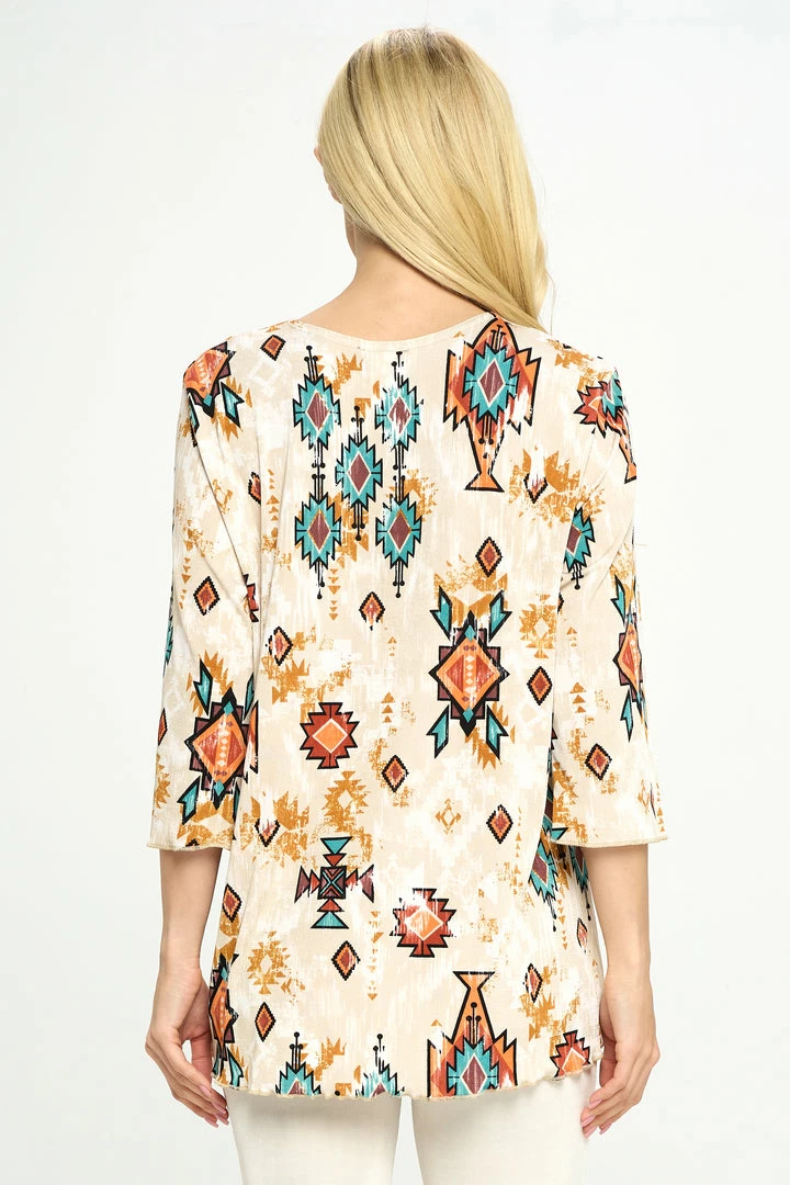 - 3/4 sleeves and soft round-neckline with Merrow bottom with a variety of prints available and an approximate length from shoulder to hem is 27 1/2 inches in size XL