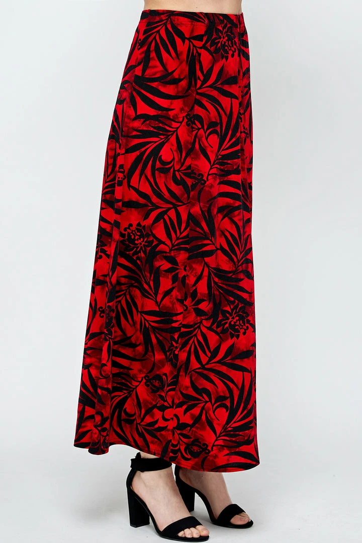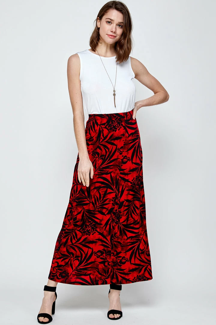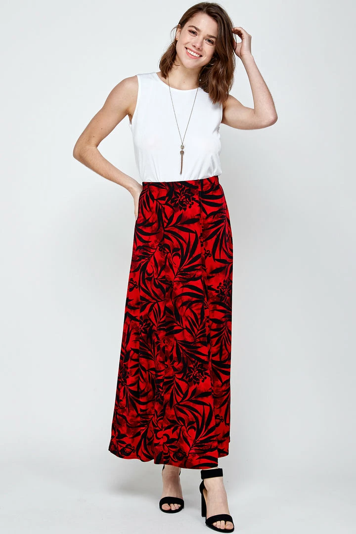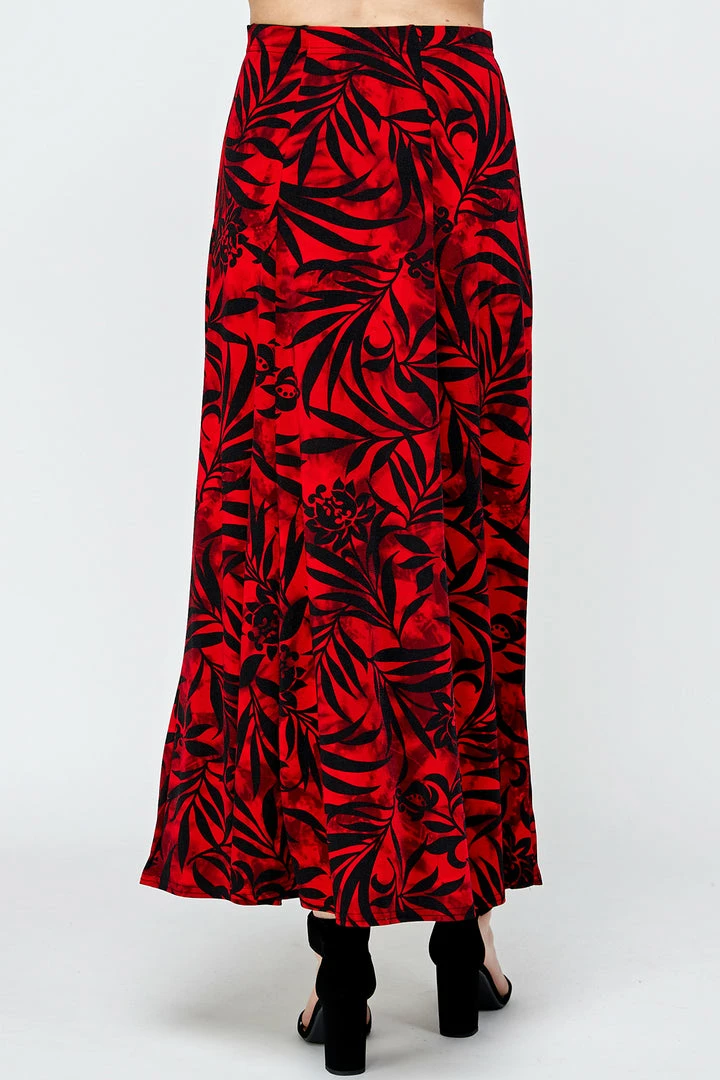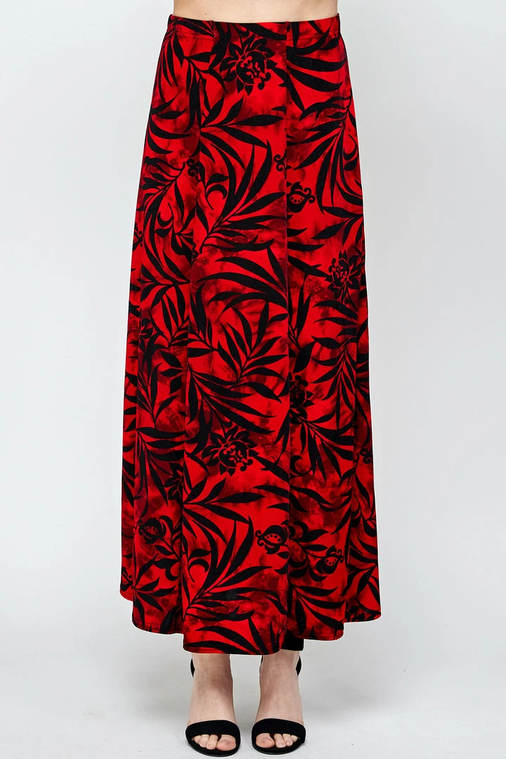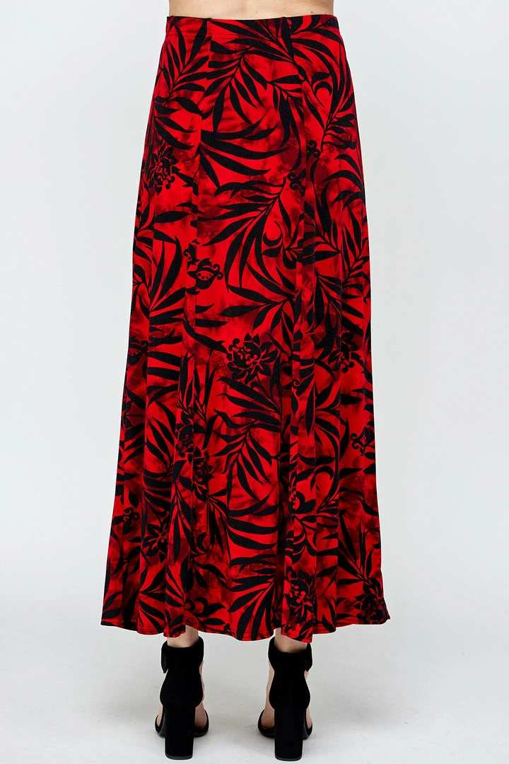 - Long flared-bottom print skirt.