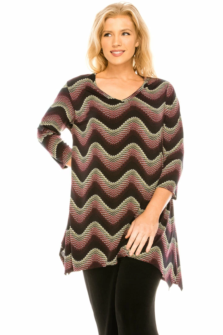 Three quarter sleeve V-neck Binding top .Hand or machine wash in cold water.Made in USA.92% Polyester, 8% Spandex.